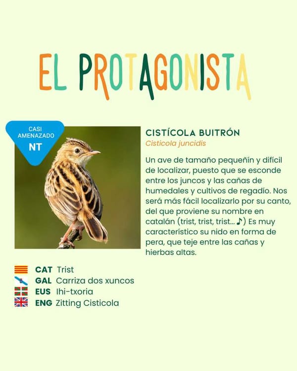 Lámina de la colección "Las 4 estaciones en el humedal" En este caso, en primavera, encontramos al buitrón (Cisticola juncidis) haciendo su nido en las partes bajas de las cañas y la vegetación acuática del humedal. Ilustración digital diseñada por @evacarret.