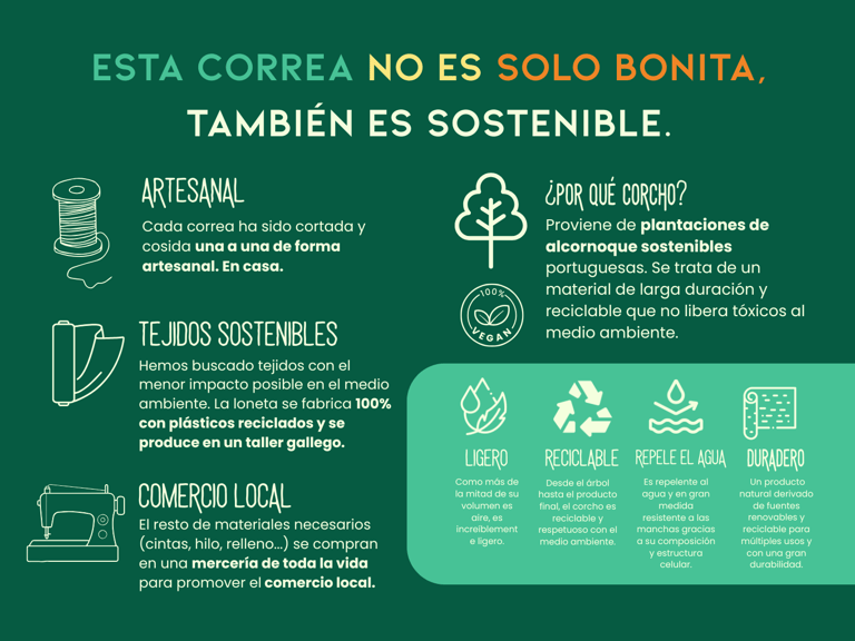 Correa artesanal cortada y cosida una a una. Hemos elegido tejidos sostenibles, como por ejemplo el corcho portugués proveniente de plantaciones de alcornoque gestionadas de manera sostenible.